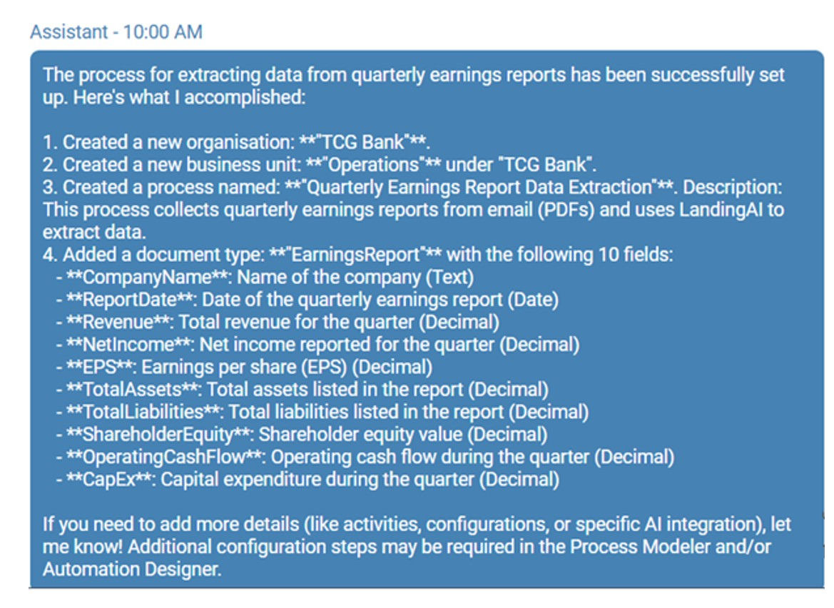 OCTO AI Assistant accelerates process application design by turning natural language into executable process models. Users can describe what they want in plain English, and OCTO automatically builds the underlying process, complete with structured activities and application frameworks. As it designs the process, OCTO also generates clear, detailed documentation—making solutions easier to understand, govern, and maintain. By connecting to external knowledge sources (such as the LandingAI ADE schema), the assistant enriches processes with additional context and intelligence, helping teams design smarter, more valuable automation use cases from day one.