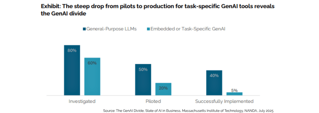 Source: ¹, ² Aditya Challapally, Chris Pease, Ramesh Raskar and Pradyumna Chari, The GenAI Divide, State of AI in Business, Massachusetts Institute of Technology, NANDA, July 2025 mlq.ai/media/quarterly_decks/v0.1_State_of_AI_in_Business_2025_Report.pdf